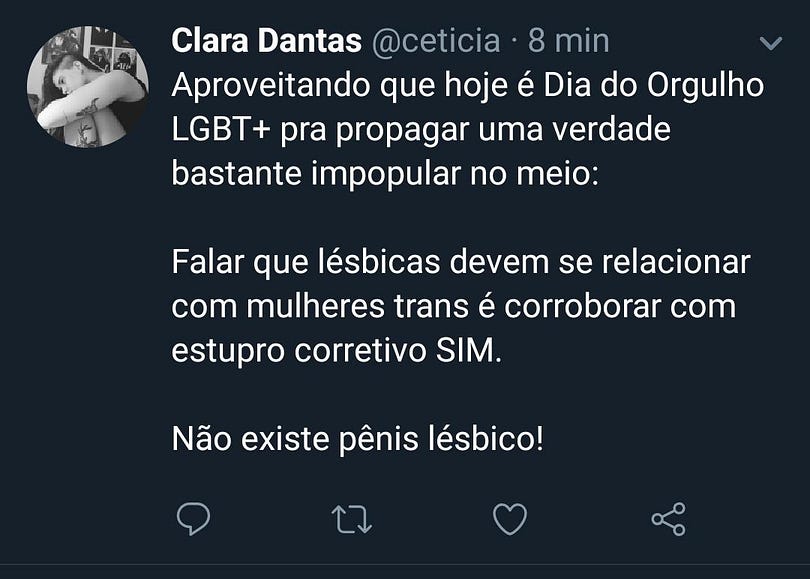Não são as mulheres lésbicas que estão matando pessoas trans. São os homens heterossexuais, em sua maioria, brancos. Os mesmos que enxergam as nossas relações com um olhar fetichista. Eles são os reais inimigos e opressores. Nós estamos apenas fazendo o que sempre fizemos, ao longo da história: rejeitando o falo.